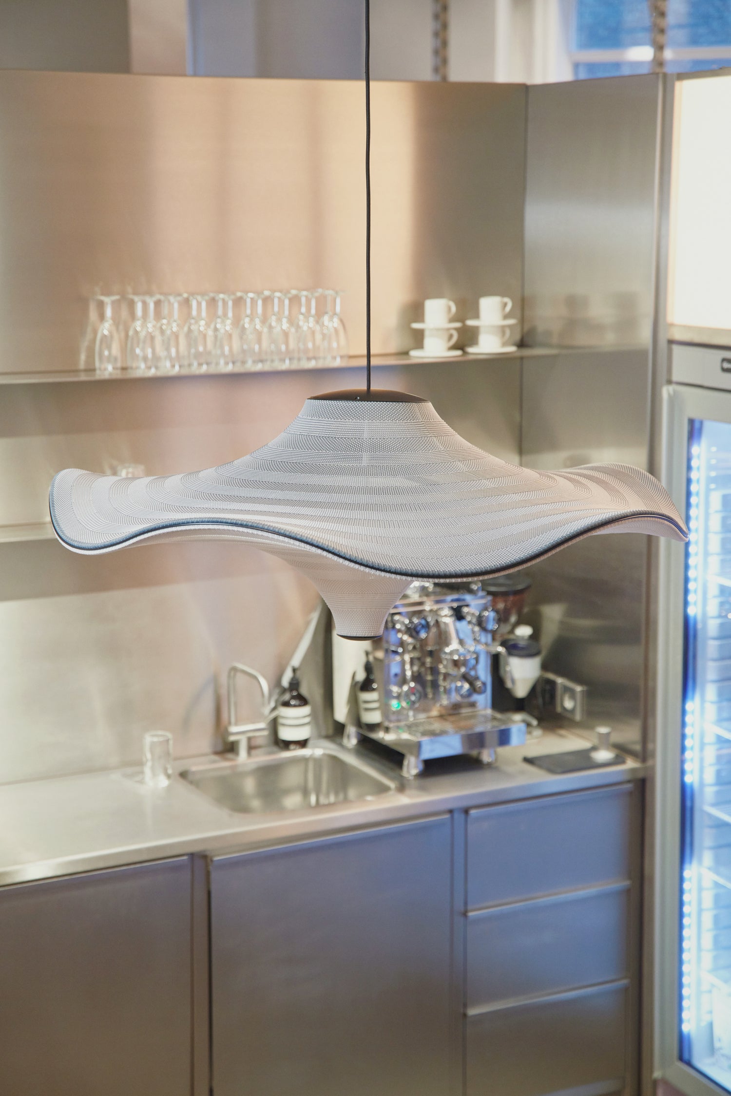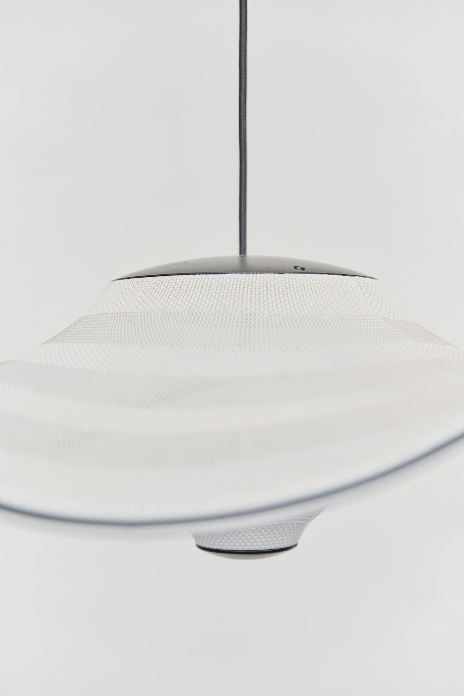 It was natural for me to base the design on my experience with 3D knitting technology accumulated during Knit-wits development. But in FLYING, I wanted to expand it to the ultimate use of knittings' physical properties by stretching it between the waving aluminium frame and the centerpiece of the lamp. The biomorphic sculptural shape of the lamp being pendant in the room is "flying"- hovering in the air...