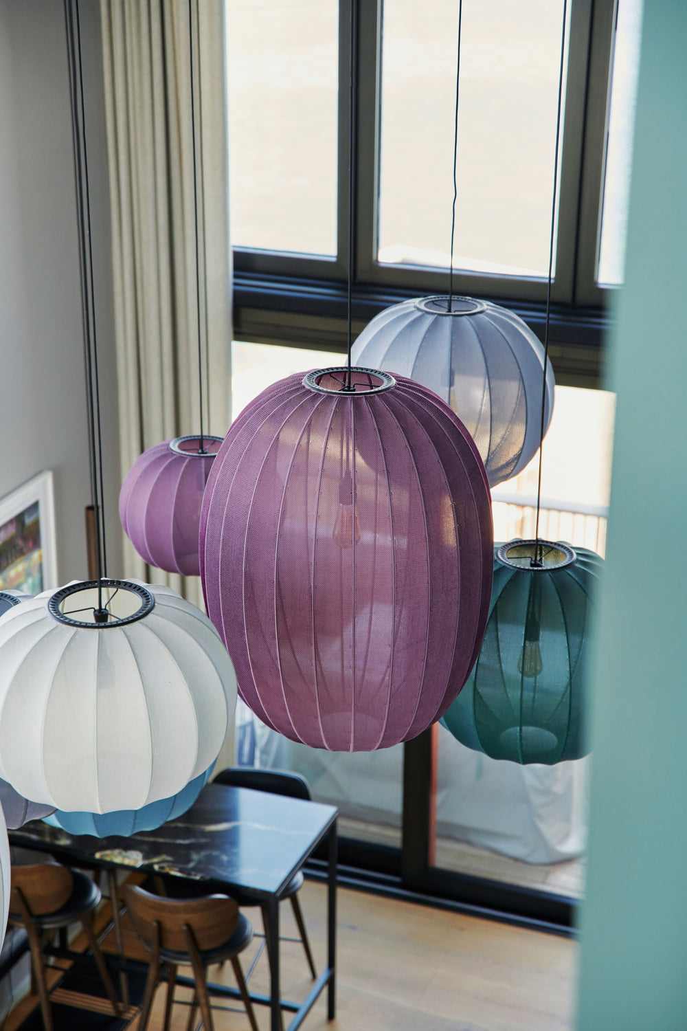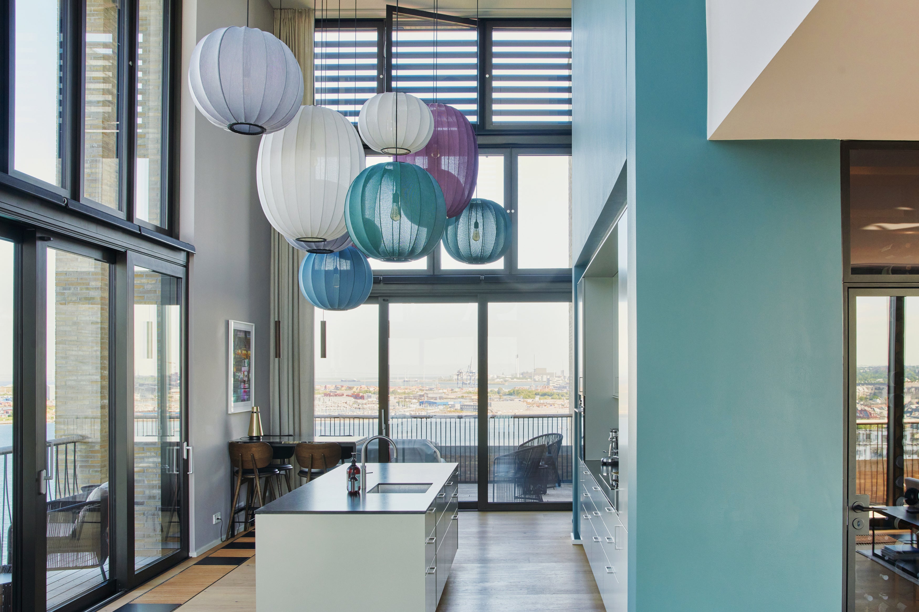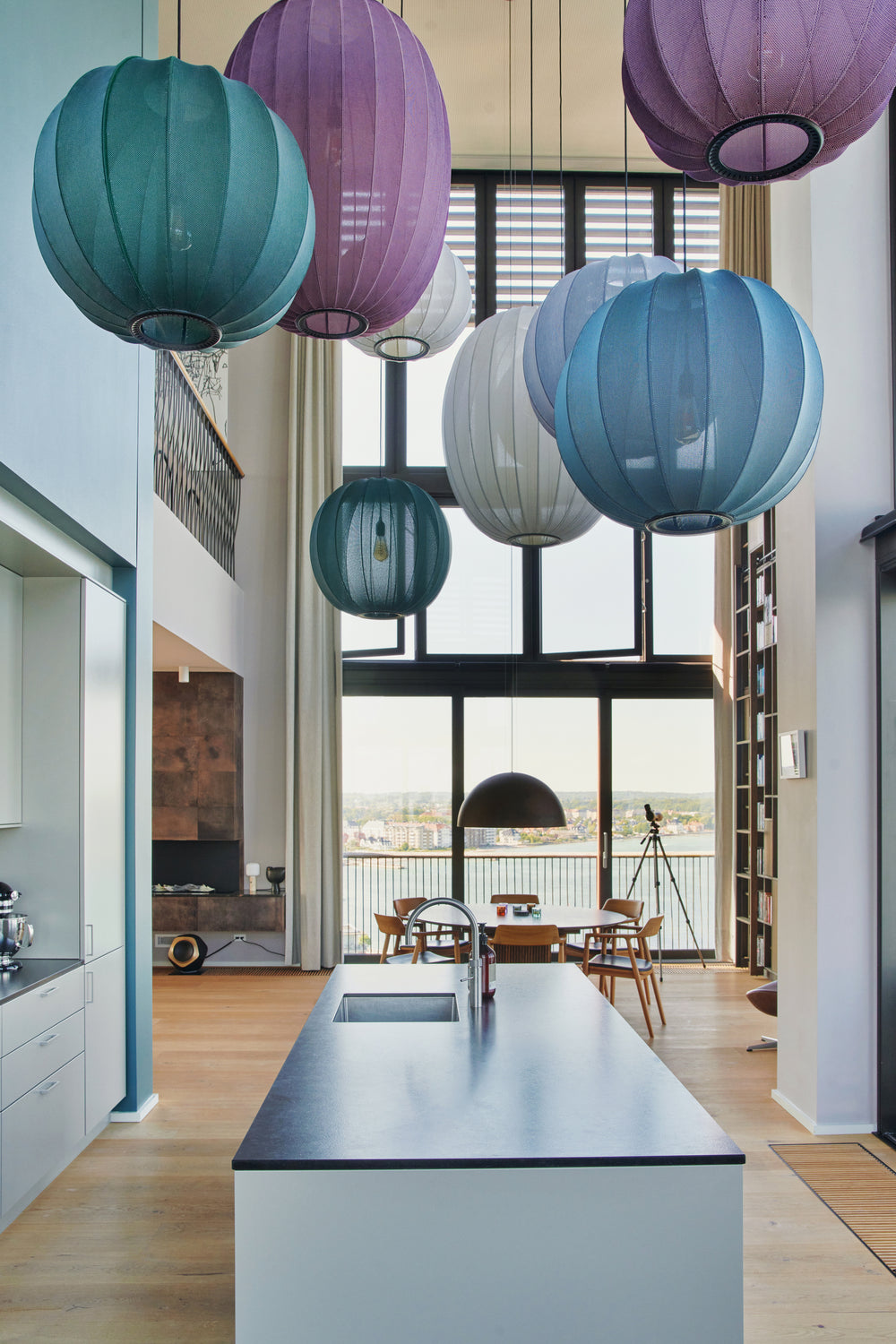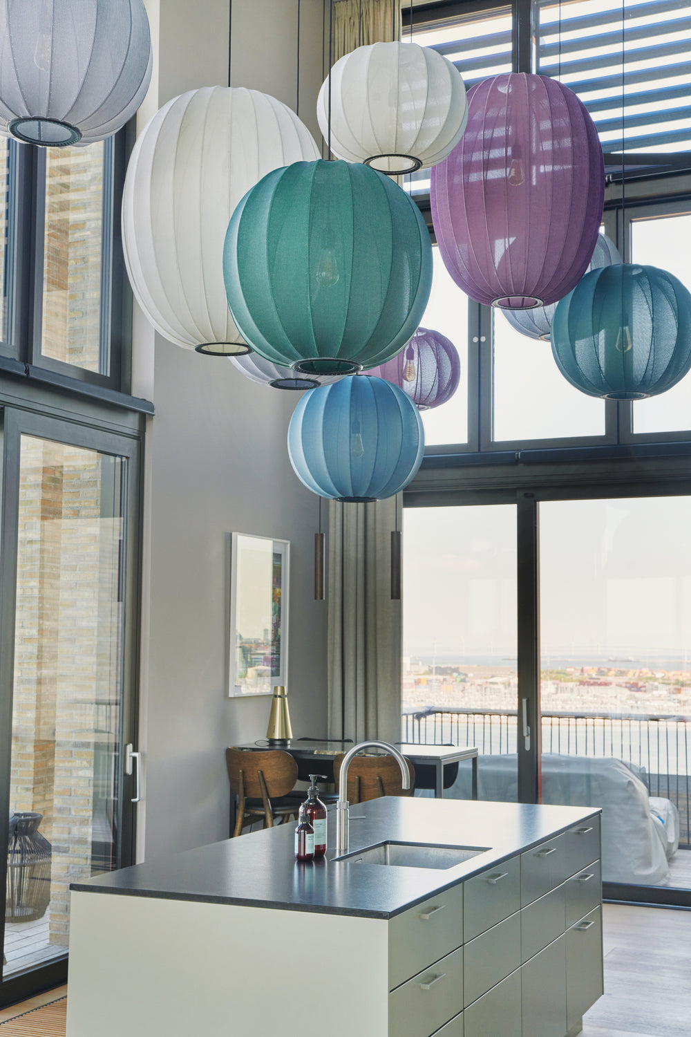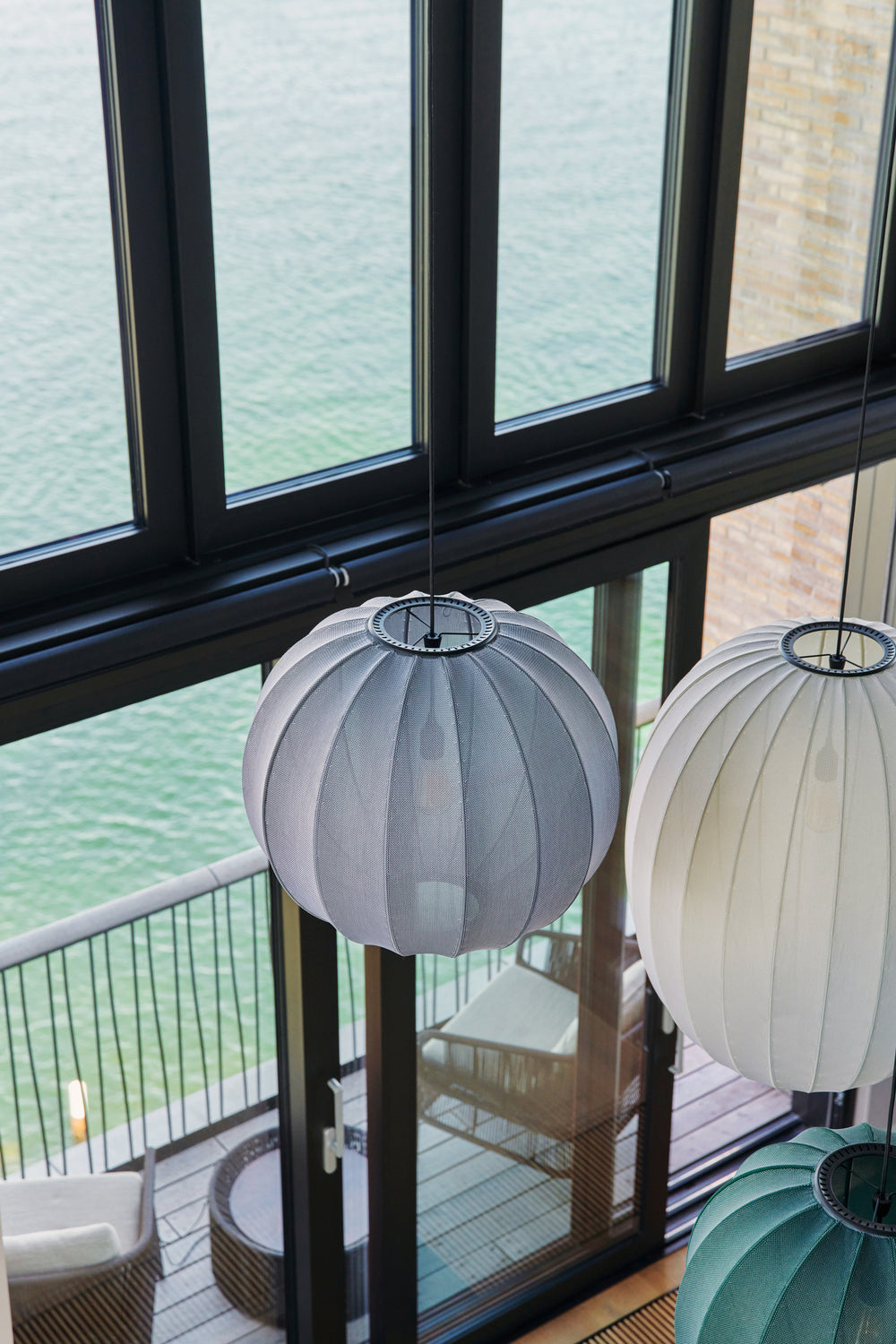 This stunning penthouse, just a bike ride from Copenhagen, offers a mesmerizing 180-degree sea view, stretching towards Copenhagen and up North, with a glimpse of the Louisiana Museum. The interior features Made by Hand’s Knit-Wit Pendants in a mix of Pearl White, Burgundy, Silver, Blue Stone, and Tweed Green, adding to the penthouse's magical and elegant ambiance.