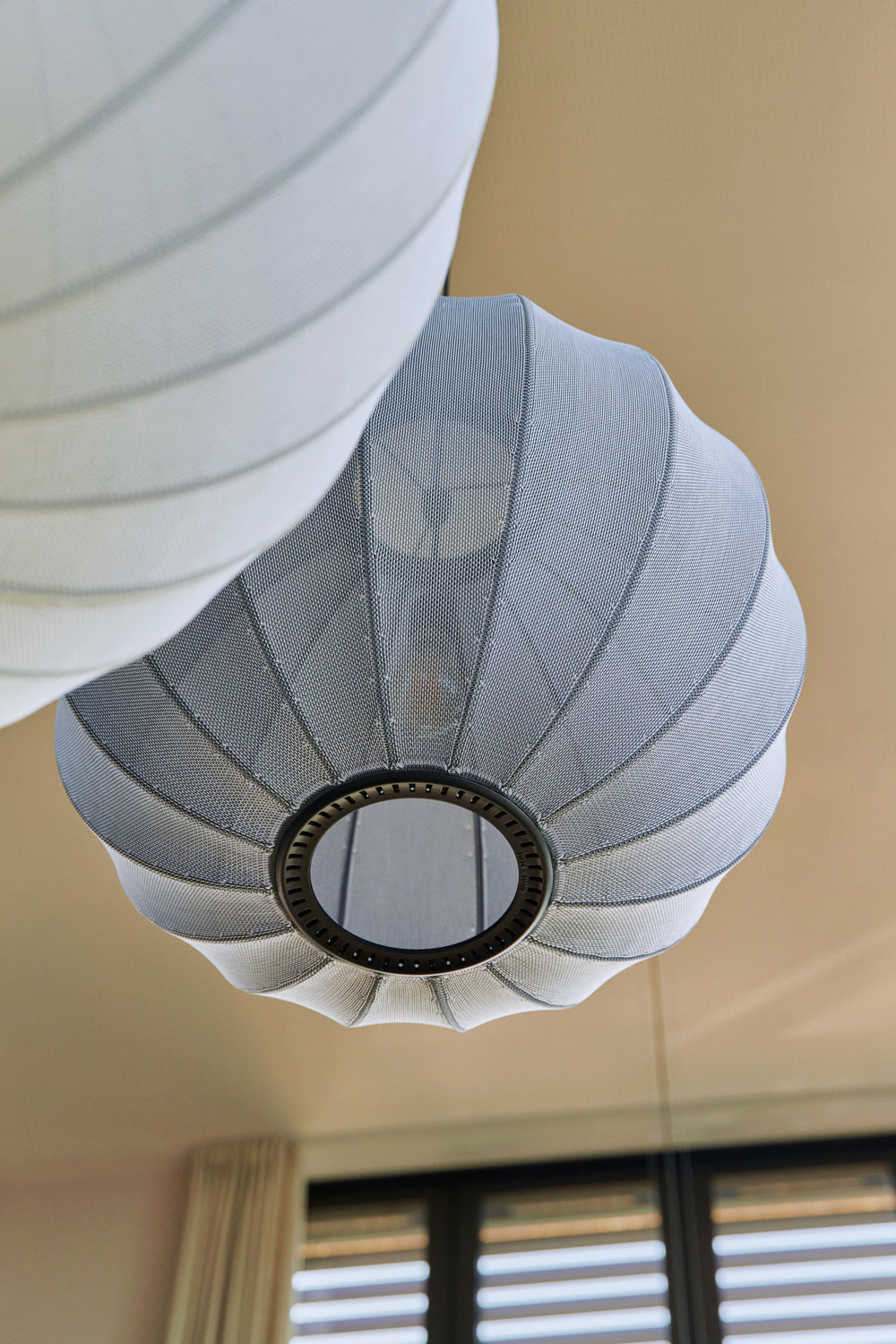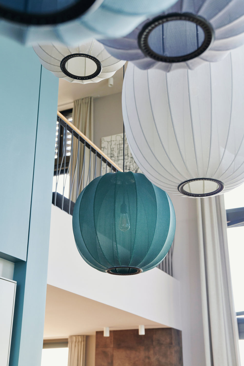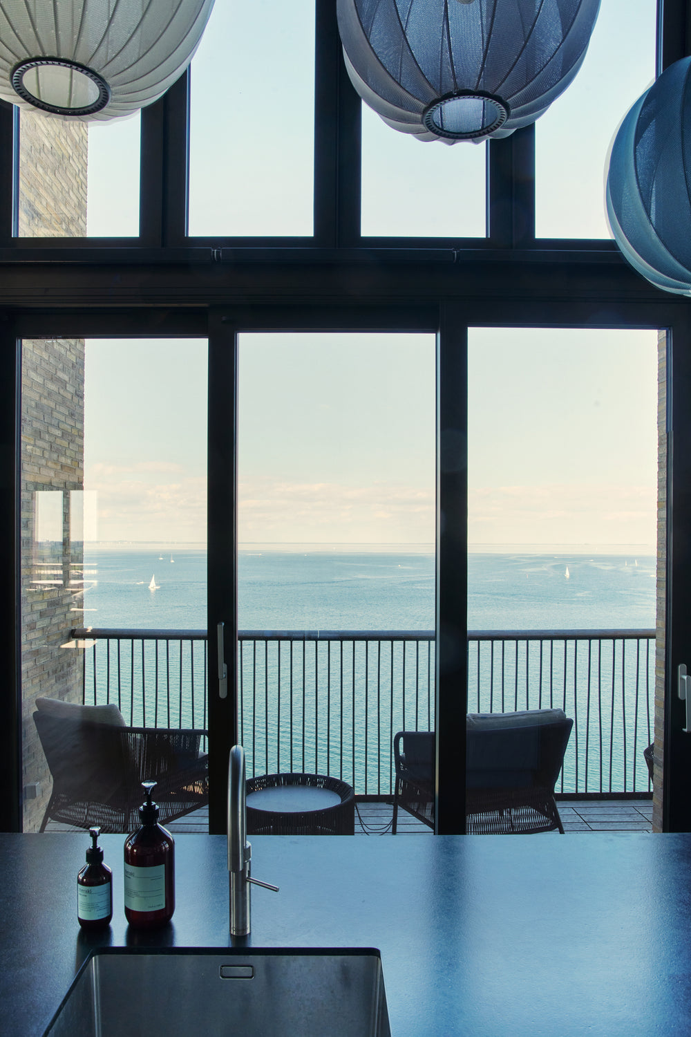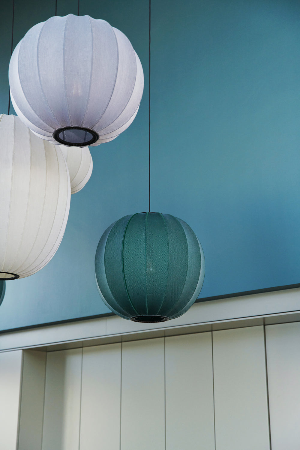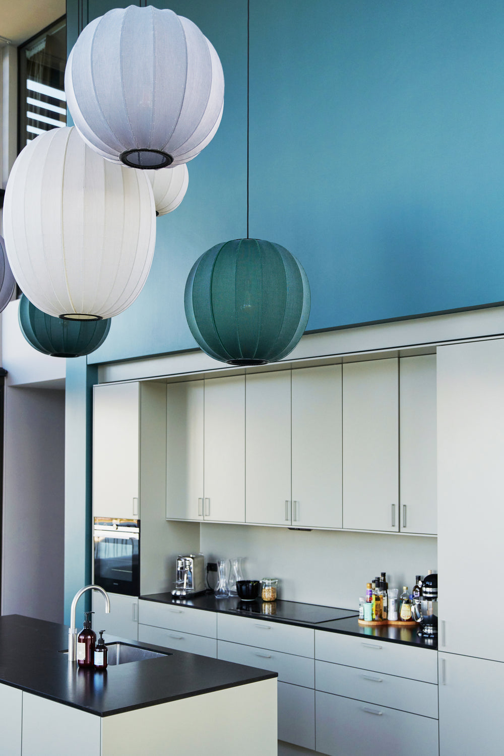 This stunning penthouse, just a bike ride from Copenhagen, offers a mesmerizing 180-degree sea view, stretching towards Copenhagen and up North, with a glimpse of the Louisiana Museum. The interior features Made by Hand’s Knit-Wit Pendants in a mix of Pearl White, Burgundy, Silver, Blue Stone, and Tweed Green, adding to the penthouse's magical and elegant ambiance.