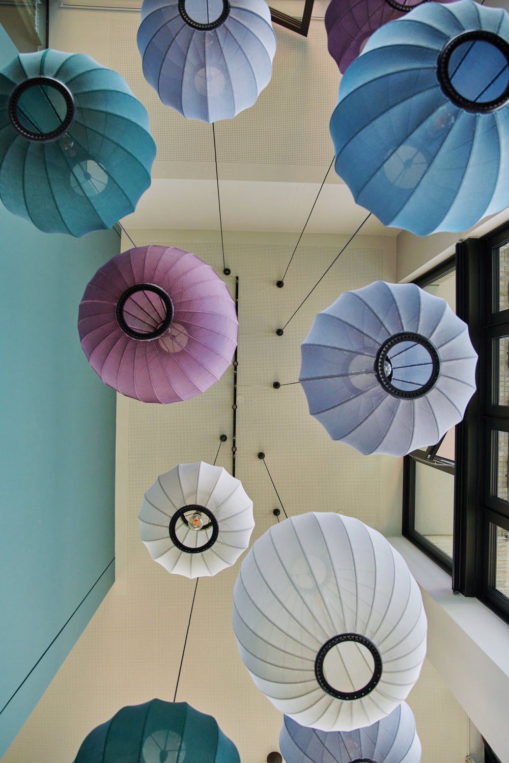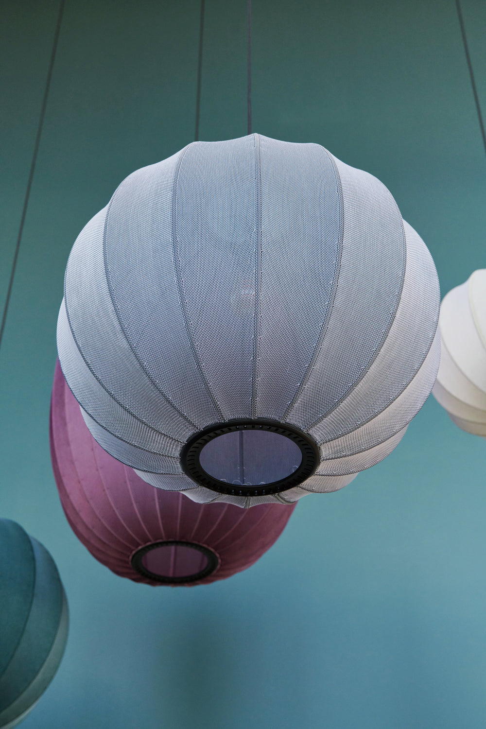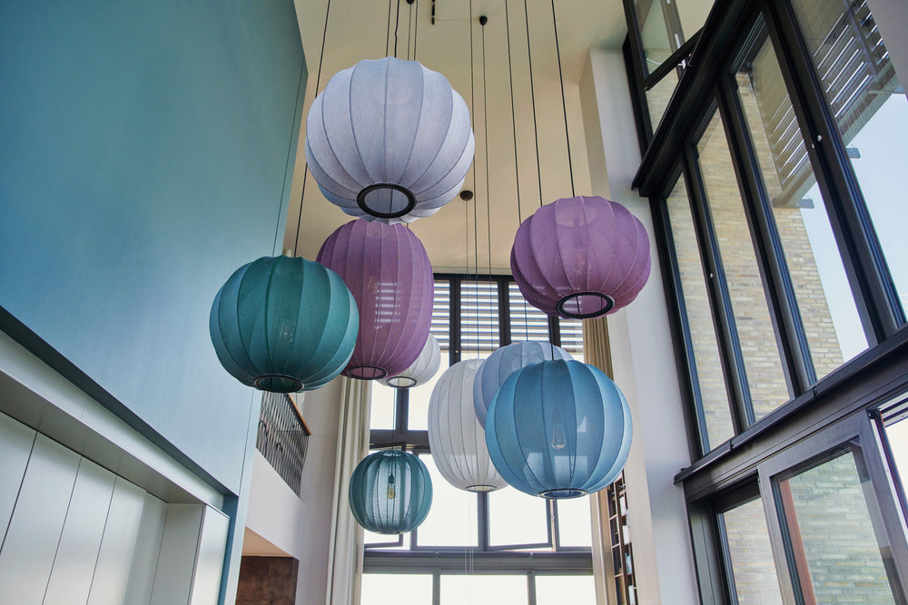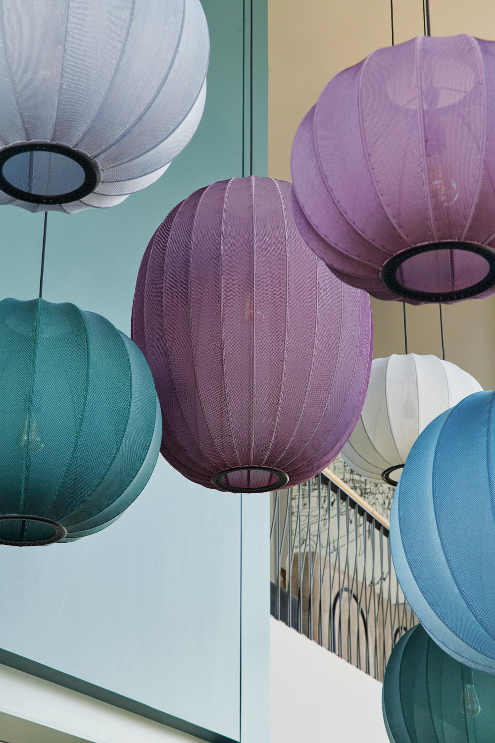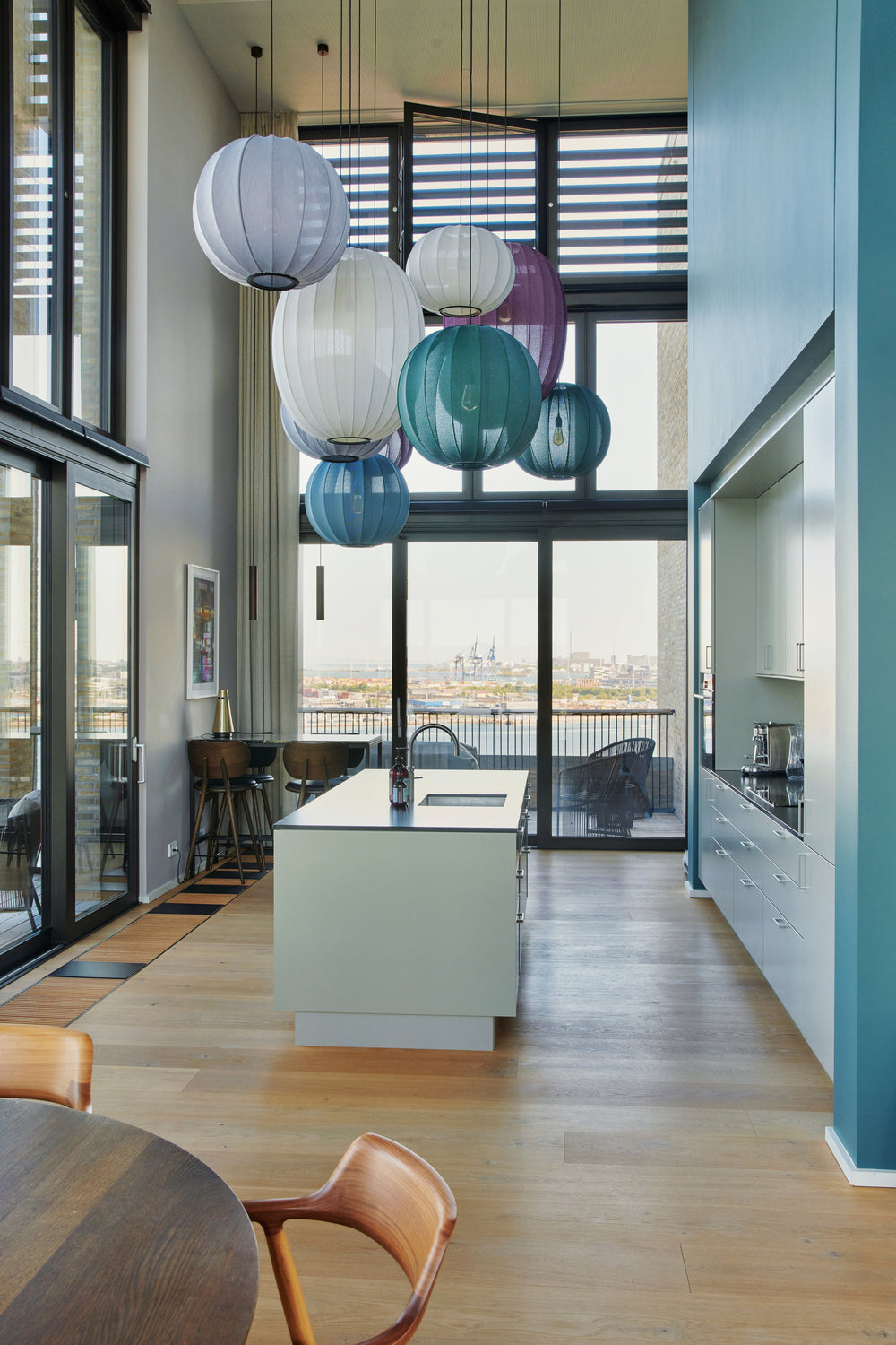 This stunning penthouse, just a bike ride from Copenhagen, offers a mesmerizing 180-degree sea view, stretching towards Copenhagen and up North, with a glimpse of the Louisiana Museum. The interior features Made by Hand’s Knit-Wit Pendants in a mix of Pearl White, Burgundy, Silver, Blue Stone, and Tweed Green, adding to the penthouse's magical and elegant ambiance.