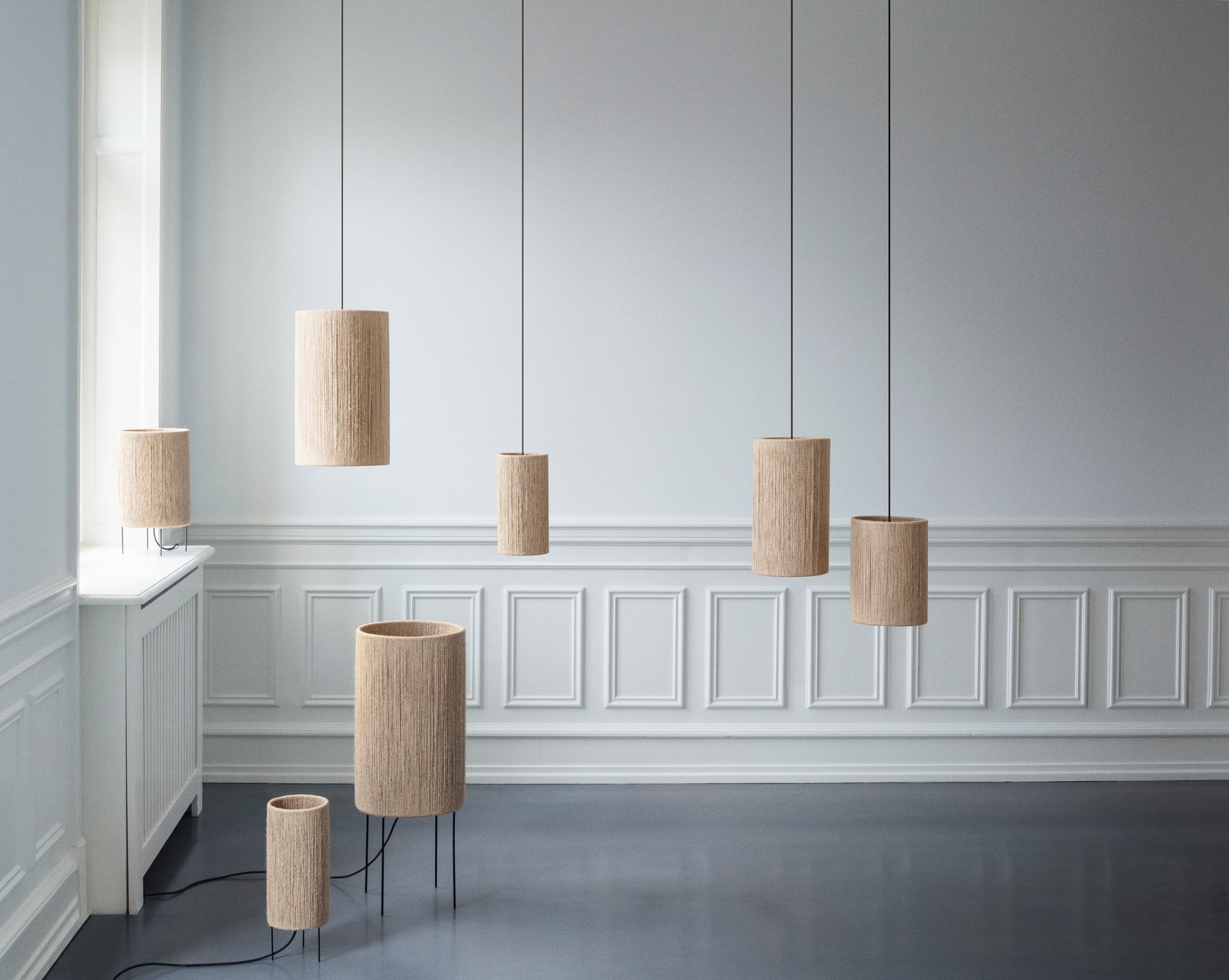 RO lamp draws inspiration from the old craft maker traditions in the 1920s and 1930s where a simple lamp shade was made of ne and yarn usually tied around a wooden stand. The RO lamp shade is made of jute yarn tied around a simple base in line with the old traditions in Denmark. The lamp name RO in Danish refers to the calmness and simple human feeling of well being.
